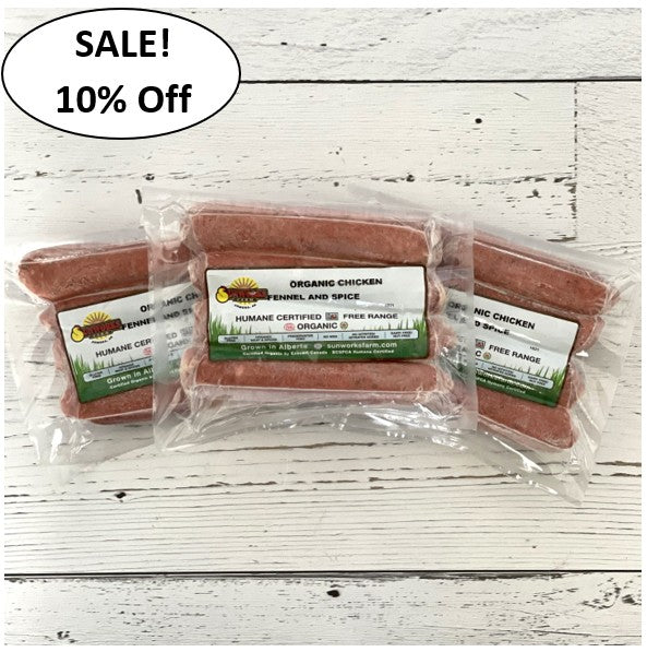 All our sausages are Gluten-free, dairy-free, nut free, soy free, nitrate/nitrite-free, sulphate/sulphite free. Made with only our own organic chicken, organic spices, salt and when needed for a little sweetness organic maple syrup or organic honey.