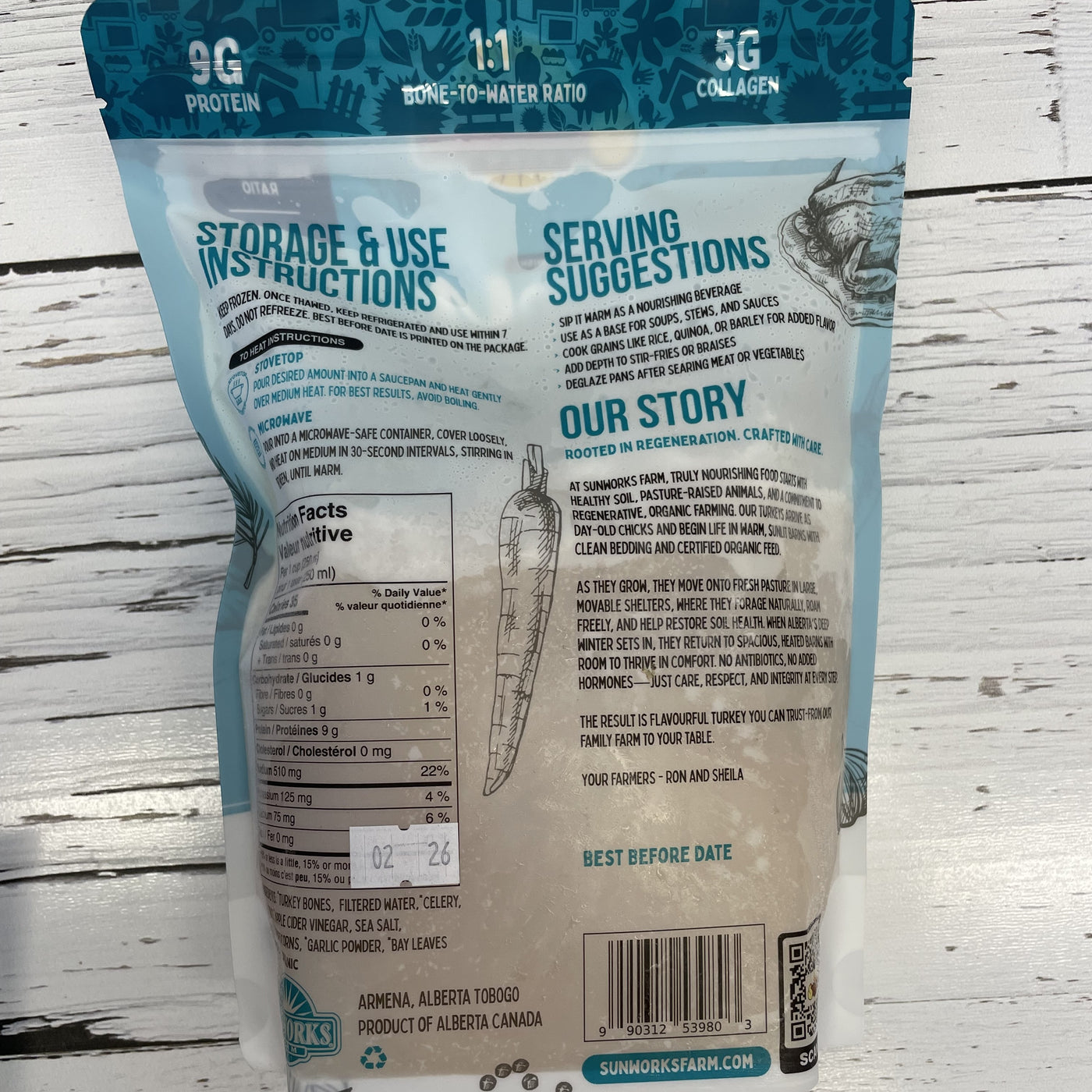 {"id":8472830279855,"title":"Turkey Bone Broth - 5 pkg","handle":"turkey-bone-broth-5-pkg","description":"\u003cp class=\"MsoNormal\"\u003e\u003cb\u003e\u003cspan style=\"font-size: 11.0pt; mso-fareast-font-family: 'Times New Roman'; color: black;\"\u003eTurkey Bone Broth - 5-Pack (Frozen)\u003cstrong\u003e \u003c\/strong\u003e\u003c\/span\u003e\u003c\/b\u003e\u003cstrong\u003e\u003cspan style=\"font-size: 11.0pt; mso-fareast-font-family: 'Times New Roman'; color: black;\"\u003e750 ml each package. Certified Organic and Certified Humane.\u003c\/span\u003e\u003c\/strong\u003e\u003c\/p\u003e\n\u003cp class=\"MsoNormal\"\u003e\u003cspan style=\"font-size: 11.0pt; mso-fareast-font-family: 'Times New Roman'; color: black;\"\u003eOur \u003cb\u003eOrganic Turkey Bone Broth\u003c\/b\u003e is made from turkeys raised on our Alberta family farm. They start in warm, sun-lit barns, then move onto pasture in the warmer months where they forage, roam freely, and help restore soil health - before returning indoors during winter.\u003c\/span\u003e\u003c\/p\u003e\n\u003cp class=\"MsoNormal\"\u003e\u003cspan style=\"font-size: 11.0pt; mso-fareast-font-family: 'Times New Roman'; color: black;\"\u003eWe roast the bones for flavour and slow-simmer \u003cb\u003eone full pound of bones per litre\u003c\/b\u003e with organic vegetables, herbs, spices, and apple cider vinegar. The result is a rich, clean broth that’s slightly lighter than beef but deeper than chicken - a favourite for soups, gravies, and sipping.\u003c\/span\u003e\u003c\/p\u003e\n\u003cp class=\"MsoNormal\"\u003e\u003cspan style=\"font-size: 11.0pt; mso-fareast-font-family: 'Times New Roman'; color: black;\"\u003eEach box includes \u003cb\u003efive 750 ml (25 oz) frozen pouches\u003c\/b\u003e.\u003c\/span\u003e\u003c\/p\u003e\n\u003cp class=\"MsoNormal\"\u003e\u003cb\u003e\u003cspan style=\"font-size: 11.0pt; mso-fareast-font-family: 'Times New Roman'; color: black;\"\u003eWhy you’ll love it\u003c\/span\u003e\u003c\/b\u003e\u003cspan style=\"font-size: 11.0pt; mso-fareast-font-family: 'Times New Roman'; color: black;\"\u003e\u003c\/span\u003e\u003c\/p\u003e\n\u003cul data-start=\"3242\" data-end=\"3436\" type=\"disc\"\u003e\n\u003cli style=\"color: black; mso-margin-top-alt: auto; mso-margin-bottom-alt: auto; mso-list: l0 level1 lfo1; tab-stops: list 36.0pt;\" class=\"MsoNormal\"\u003e\u003cspan style=\"font-size: 11.0pt; mso-fareast-font-family: 'Times New Roman';\"\u003e9 g protein \u0026amp; 5 g collagen per 250 ml\u003c\/span\u003e\u003c\/li\u003e\n\u003cli style=\"color: black; mso-margin-top-alt: auto; mso-margin-bottom-alt: auto; mso-list: l0 level1 lfo1; tab-stops: list 36.0pt;\" class=\"MsoNormal\"\u003e\u003cspan style=\"font-size: 11.0pt; mso-fareast-font-family: 'Times New Roman';\"\u003e1:1 bone-to-water ratio\u003c\/span\u003e\u003c\/li\u003e\n\u003cli style=\"color: black; mso-margin-top-alt: auto; mso-margin-bottom-alt: auto; mso-list: l0 level1 lfo1; tab-stops: list 36.0pt;\" class=\"MsoNormal\"\u003e\u003cspan style=\"font-size: 11.0pt; mso-fareast-font-family: 'Times New Roman';\"\u003eCertified Organic (Ecocert Canada)\u003c\/span\u003e\u003c\/li\u003e\n\u003cli style=\"color: black; mso-margin-top-alt: auto; mso-margin-bottom-alt: auto; mso-list: l0 level1 lfo1; tab-stops: list 36.0pt;\" class=\"MsoNormal\"\u003e\u003cspan style=\"font-size: 11.0pt; mso-fareast-font-family: 'Times New Roman';\"\u003eNo antibiotics, no added hormones, no GMOs\u003c\/span\u003e\u003c\/li\u003e\n\u003cli style=\"color: black; mso-margin-top-alt: auto; mso-margin-bottom-alt: auto; mso-list: l0 level1 lfo1; tab-stops: list 36.0pt;\" class=\"MsoNormal\"\u003e\u003cspan style=\"font-size: 11.0pt; mso-fareast-font-family: 'Times New Roman';\"\u003eGluten-free, paleo \u0026amp; keto friendly\u003c\/span\u003e\u003c\/li\u003e\n\u003c\/ul\u003e\n\u003cp class=\"MsoNormal\"\u003e\u003cb\u003e\u003cspan style=\"font-size: 11.0pt; mso-fareast-font-family: 'Times New Roman'; color: black;\"\u003eHow to use\u003c\/span\u003e\u003c\/b\u003e\u003cspan style=\"font-size: 11.0pt; mso-fareast-font-family: 'Times New Roman'; color: black;\"\u003e\u003cbr\u003ePerfect for soups, sauces, gravies, grains, or sipping warm as a nourishing drink.\u003c\/span\u003e\u003cstrong\u003e\u003c\/strong\u003e\u003c\/p\u003e\n\u003cp class=\"MsoNormal\"\u003e\u003cstrong\u003eIndividual packages of this product are also available for purchase at our own locations in Edmonton and Calgary.\u003c\/strong\u003e\u003c\/p\u003e\n\u003cp style=\"margin-bottom: 0cm;\" class=\"MsoNormal\"\u003e\u003cstrong\u003e\u003cimg alt=\"\" src=\"https:\/\/cdn.shopify.com\/s\/files\/1\/0251\/4147\/7427\/files\/Logos_for_Website.jpg?v=1739995372\" width=\"335\" height=\"97\" style=\"display: block; margin-left: auto; margin-right: auto;\"\u003e\u003c\/strong\u003e\u003c\/p\u003e\n\u003cp style=\"margin-bottom: 0cm;\" class=\"MsoNormal\"\u003e\u003cspan style=\"color: #000000;\"\u003e\u003cem\u003e\u003cstrong\u003eAny applicable online discounts will be automatically applied at checkout and can be viewed on the cart page\u003c\/strong\u003e\u003c\/em\u003e\u003c\/span\u003e\u003c\/p\u003e","published_at":"2026-01-21T09:36:27-07:00","created_at":"2026-01-20T09:51:10-07:00","vendor":"Sunworks Farm","type":"turkey","tags":["sausages","Turkey"],"price":8000,"price_min":8000,"price_max":8000,"available":true,"price_varies":false,"compare_at_price":null,"compare_at_price_min":0,"compare_at_price_max":0,"compare_at_price_varies":false,"variants":[{"id":46503043432623,"title":"Default Title","option1":"Default Title","option2":null,"option3":null,"sku":"MEATBOX9320","requires_shipping":false,"taxable":false,"featured_image":null,"available":true,"name":"Turkey Bone Broth - 5 pkg","public_title":null,"options":["Default Title"],"price":8000,"weight":0,"compare_at_price":null,"inventory_management":"shopify","barcode":null,"requires_selling_plan":false,"selling_plan_allocations":[],"quantity_rule":{"min":