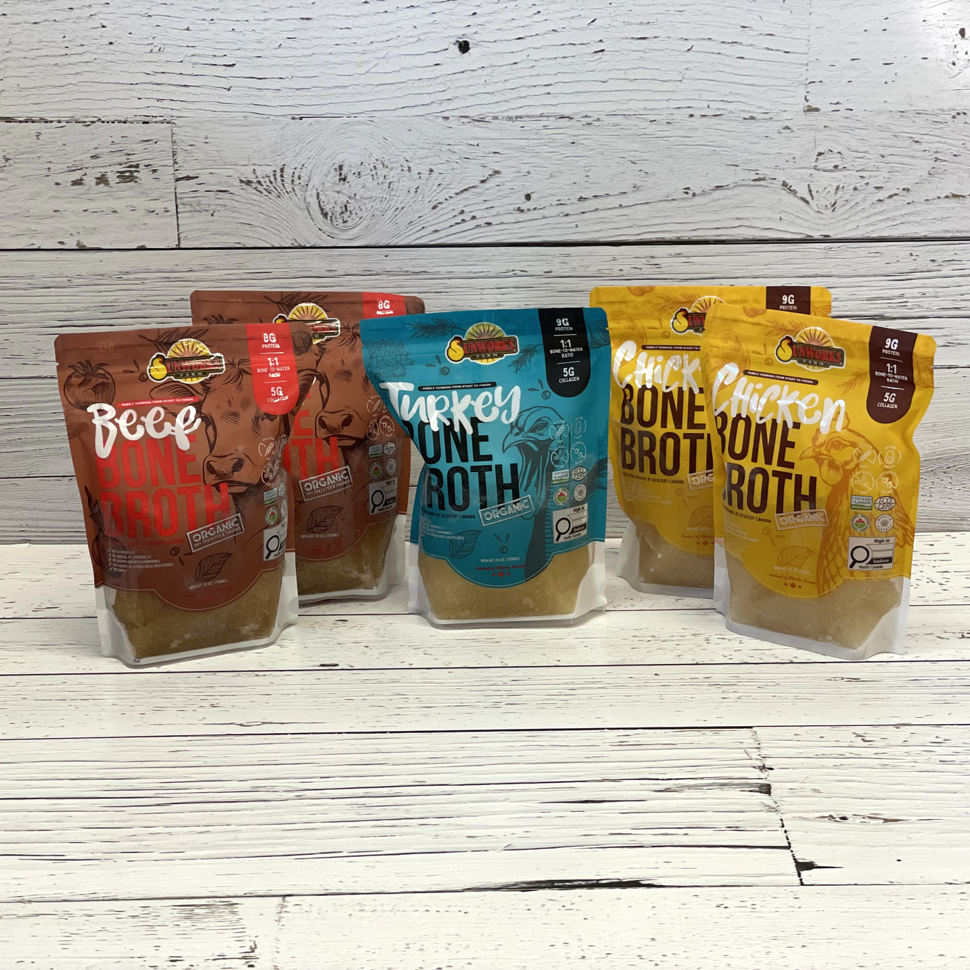 {"id":8472833163439,"title":"Bone Broth Variety Pack - 5 pkg","handle":"bone-broth-variety-pack-5-pkg","description":"\u003cp class=\"MsoNormal\"\u003e\u003cb\u003e\u003cspan style=\"font-size: 11.0pt; mso-fareast-font-family: 'Times New Roman'; color: black;\"\u003eBone Broth Mixed Pack — 5-Pack (Frozen) \u003c\/span\u003e\u003c\/b\u003e\u003cspan style=\"font-size: 11.0pt; mso-fareast-font-family: 'Times New Roman'; color: black;\"\u003e\u003c\/span\u003e\u003cb\u003e\u003cspan style=\"font-size: 11.0pt; mso-fareast-font-family: 'Times New Roman'; color: black;\"\u003e(2 Beef • 2 Chicken • 1 Turkey)\u003cstrong\u003e \u003c\/strong\u003e\u003c\/span\u003e\u003c\/b\u003e\u003cstrong\u003e\u003cspan style=\"font-size: 11.0pt; mso-fareast-font-family: 'Times New Roman'; color: black;\"\u003e750 ml each package. Certified Organic and Certified Humane.\u003c\/span\u003e\u003c\/strong\u003e\u003c\/p\u003e\n\u003cp class=\"MsoNormal\"\u003e\u003cspan style=\"font-size: 11.0pt; mso-fareast-font-family: 'Times New Roman'; color: black;\"\u003eCan’t choose just one? Our \u003cb\u003eOrganic Bone Broth Mixed Pack\u003c\/b\u003e lets you enjoy the full range of Sunworks flavour and nutrition in one box. This pack includes a mix of \u003cb\u003ebeef, chicken, and turkey bone broth\u003c\/b\u003e, all slow-crafted on our Alberta family farm using certified organic, regenerative practices.\u003c\/span\u003e\u003c\/p\u003e\n\u003cp class=\"MsoNormal\"\u003e\u003cspan style=\"font-size: 11.0pt; mso-fareast-font-family: 'Times New Roman'; color: black;\"\u003eEach broth is made with \u003cb\u003eone full pound of bones per litre\u003c\/b\u003e, roasted for depth of flavour and slow-simmered with organic vegetables, herbs, spices, and apple cider vinegar — no additives, no shortcuts, just real food from our family to yours.\u003c\/span\u003e\u003c\/p\u003e\n\u003cp class=\"MsoNormal\"\u003e\u003cb\u003e\u003cspan style=\"font-size: 11.0pt; mso-fareast-font-family: 'Times New Roman'; color: black;\"\u003eWhat’s in the box\u003c\/span\u003e\u003c\/b\u003e\u003cspan style=\"font-size: 11.0pt; mso-fareast-font-family: 'Times New Roman'; color: black;\"\u003e\u003c\/span\u003e\u003c\/p\u003e\n\u003cul data-start=\"835\" data-end=\"972\" type=\"disc\"\u003e\n\u003cli style=\"color: black; mso-margin-top-alt: auto; mso-margin-bottom-alt: auto; mso-list: l1 level1 lfo1; tab-stops: list 36.0pt;\" class=\"MsoNormal\"\u003e\u003cspan style=\"font-size: 11.0pt; mso-fareast-font-family: 'Times New Roman';\"\u003e2 × Organic Beef Bone Broth (750 ml each)\u003c\/span\u003e\u003c\/li\u003e\n\u003cli style=\"color: black; mso-margin-top-alt: auto; mso-margin-bottom-alt: auto; mso-list: l1 level1 lfo1; tab-stops: list 36.0pt;\" class=\"MsoNormal\"\u003e\u003cspan style=\"font-size: 11.0pt; mso-fareast-font-family: 'Times New Roman';\"\u003e2 × Organic Chicken Bone Broth (750 ml each)\u003c\/span\u003e\u003c\/li\u003e\n\u003cli style=\"color: black; mso-margin-top-alt: auto; mso-margin-bottom-alt: auto; mso-list: l1 level1 lfo1; tab-stops: list 36.0pt;\" class=\"MsoNormal\"\u003e\u003cspan style=\"font-size: 11.0pt; mso-fareast-font-family: 'Times New Roman';\"\u003e1 × Organic Turkey Bone Broth (750 ml)\u003c\/span\u003e\u003c\/li\u003e\n\u003c\/ul\u003e\n\u003cp class=\"MsoNormal\"\u003e\u003cb\u003e\u003cspan style=\"font-size: 11.0pt; mso-fareast-font-family: 'Times New Roman'; color: black;\"\u003eWhy you’ll love it\u003c\/span\u003e\u003c\/b\u003e\u003cspan style=\"font-size: 11.0pt; mso-fareast-font-family: 'Times New Roman'; color: black;\"\u003e\u003c\/span\u003e\u003c\/p\u003e\n\u003cul data-start=\"997\" data-end=\"1198\" type=\"disc\"\u003e\n\u003cli style=\"color: black; mso-margin-top-alt: auto; mso-margin-bottom-alt: auto; mso-list: l0 level1 lfo2; tab-stops: list 36.0pt;\" class=\"MsoNormal\"\u003e\u003cspan style=\"font-size: 11.0pt; mso-fareast-font-family: 'Times New Roman';\"\u003eHigh in protein \u0026amp; collagen\u003c\/span\u003e\u003c\/li\u003e\n\u003cli style=\"color: black; mso-margin-top-alt: auto; mso-margin-bottom-alt: auto; mso-list: l0 level1 lfo2; tab-stops: list 36.0pt;\" class=\"MsoNormal\"\u003e\u003cspan style=\"font-size: 11.0pt; mso-fareast-font-family: 'Times New Roman';\"\u003e1:1 bone-to-water ratio across all broths\u003c\/span\u003e\u003c\/li\u003e\n\u003cli style=\"color: black; mso-margin-top-alt: auto; mso-margin-bottom-alt: auto; mso-list: l0 level1 lfo2; tab-stops: list 36.0pt;\" class=\"MsoNormal\"\u003e\u003cspan style=\"font-size: 11.0pt; mso-fareast-font-family: 'Times New Roman';\"\u003eCertified Organic (Ecocert Canada)\u003c\/span\u003e\u003c\/li\u003e\n\u003cli style=\"color: black; mso-margin-top-alt: auto; mso-margin-bottom-alt: auto; mso-list: l0 level1 lfo2; tab-stops: list 36.0pt;\" class=\"MsoNormal\"\u003e\u003cspan style=\"font-size: 11.0pt; mso-fareast-font-family: 'Times New Roman';\"\u003eNo antibiotics, no added hormones, no GMOs\u003c\/span\u003e\u003c\/li\u003e\n\u003cli style=\"color: black; mso-margin-top-alt: auto; mso-margin-bottom-alt: auto; mso-list: l0 level1 lfo2; tab-stops: list 36.0pt;\" class=\"MsoNormal\"\u003e\u003cspan style=\"font-size: 11.0pt; mso-fareast-font-family: 'Times New Roman';\"\u003eGluten-free, paleo \u0026amp; keto friendly\u003c\/span\u003e\u003c\/li\u003e\n\u003c\/ul\u003e\n\u003cp class=\"MsoNormal\"\u003e\u003cspan style=\"font-size: 11.0pt; mso-fareast-font-family: 'Times New Roman'; color: black;\"\u003ePerfect for stocking your freezer, everyday cooking, or discovering which broth becomes your go-to.\u003c\/span\u003e\u003c\/p\u003e\n\u003cp class=\"MsoNormal\"\u003e\u003cstrong\u003eIndividual packages of this product are also available for purchase at our own locations in Edmonton and Calgary.\u003c\/strong\u003e\u003c\/p\u003e\n\u003cp style=\"margin-bottom: 0cm;\" class=\"MsoNormal\"\u003e\u003cstrong\u003e\u003cimg alt=\"\" src=\"https:\/\/cdn.shopify.com\/s\/files\/1\/0251\/4147\/7427\/files\/Lo
